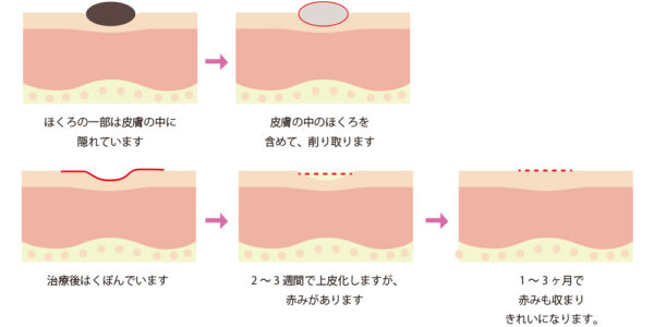 激光去除后的创面会形成微小凹陷。术后数日内需在患处充分涂抹软膏(凡士林)促进皮肤再生。根据痣的大小,约1至3周表皮即可再生闭合伤口,此后会残留红晕。