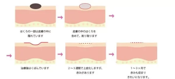激光祛痣后,原痣部位会形成微小凹陷(小孔)。随着皮肤再生,约2~3周后新皮肤将覆盖凹陷处使其平整(上皮化),期间需持续使用药膏与保护贴进行护理。上皮化后会呈现粉红色至泛红状态,约1~3个月红晕逐渐消退,与周围肌肤自然融合。